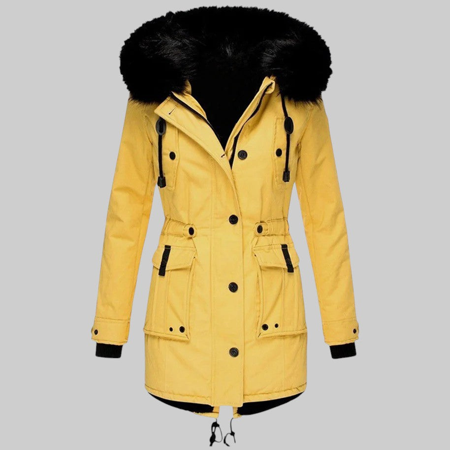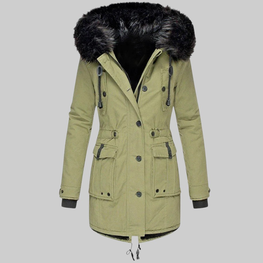 Stiilne parkajakk kuldse, musta ja rohelise kunstkarusnahkse kapuutsiga, reguleeritava vöökoht ja mitme taskuga, saadaval kolmes värvitoonis.