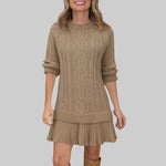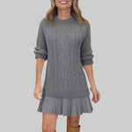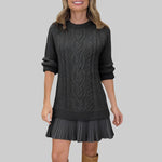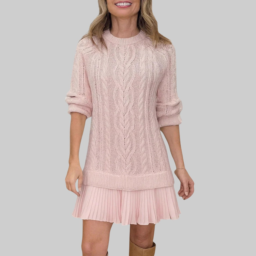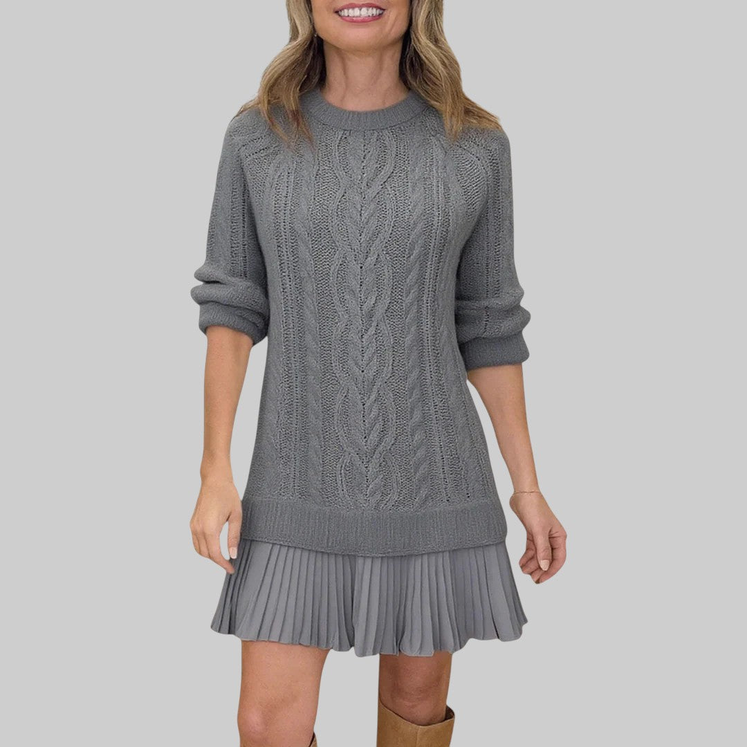 Kleidi lõige on sirge ja kehakujule sobiv, kaunistatud peene voltimisega, mis lisab ajatu kudumise disainile elegantse ja mängulise nüansi.