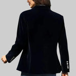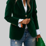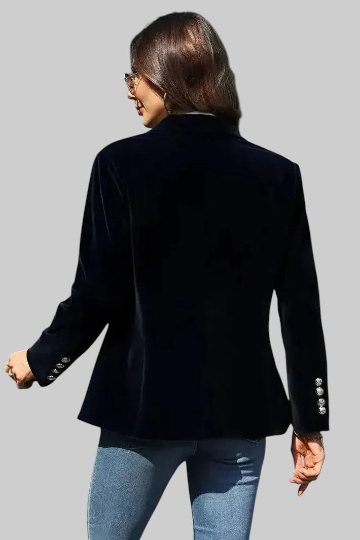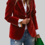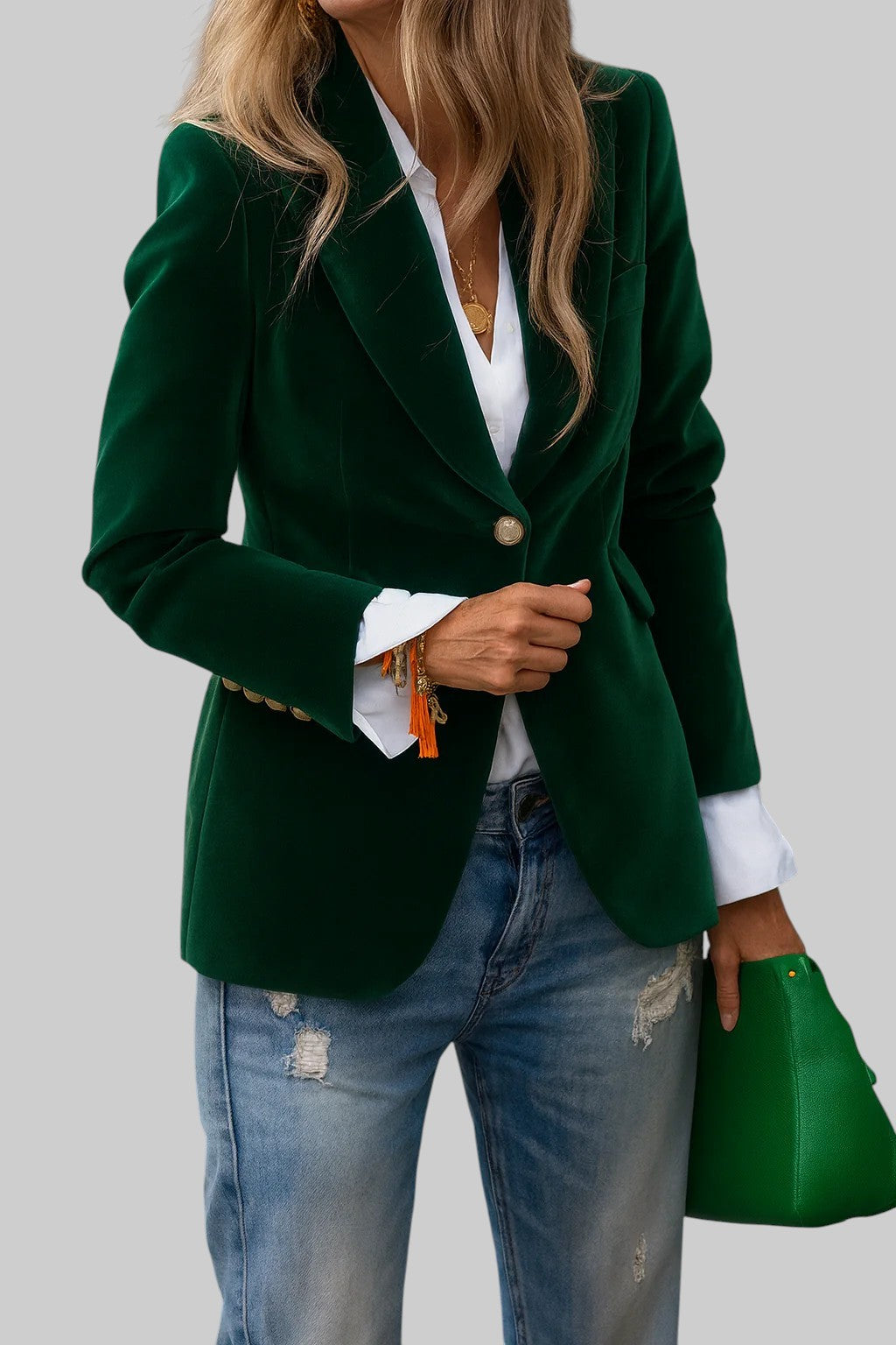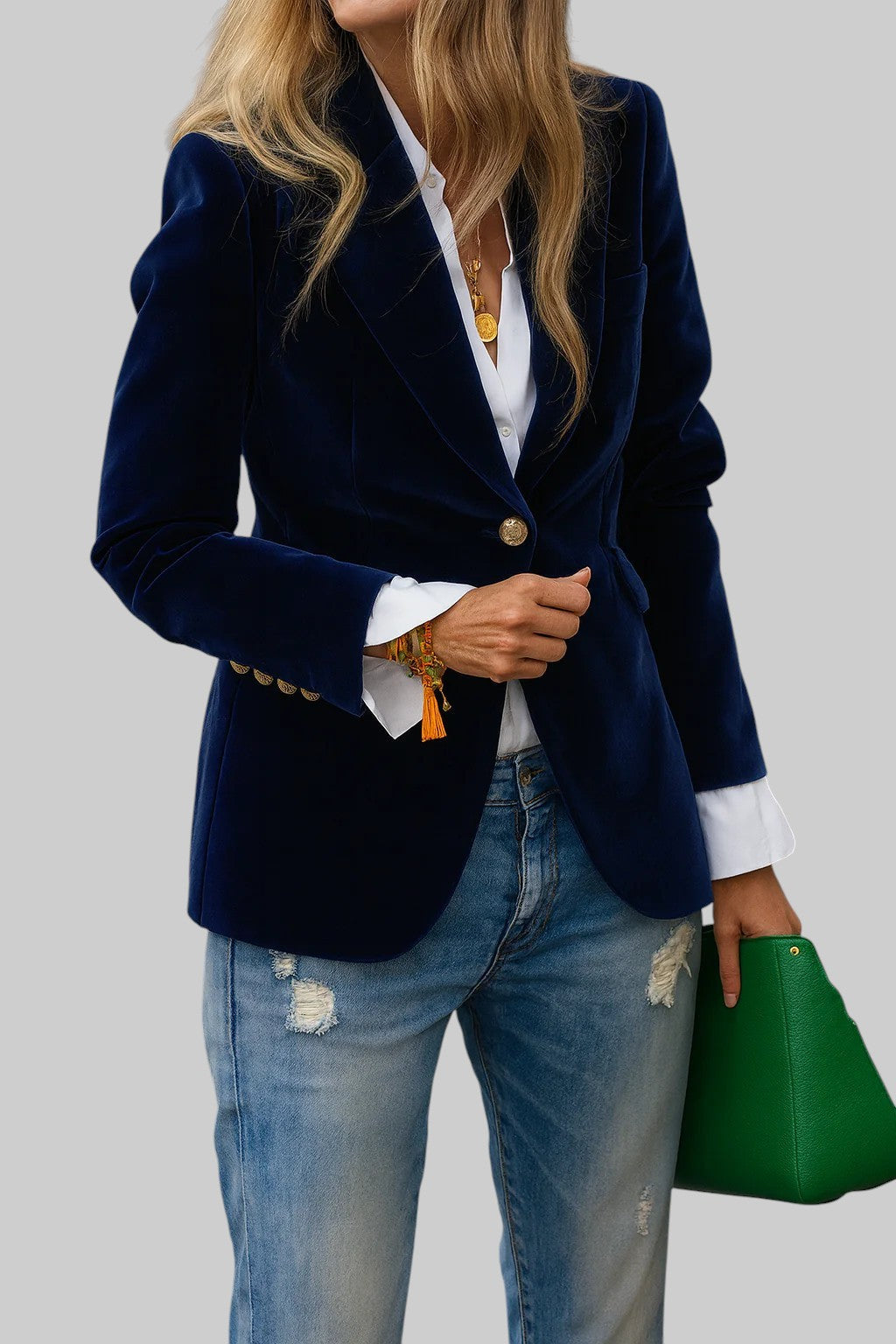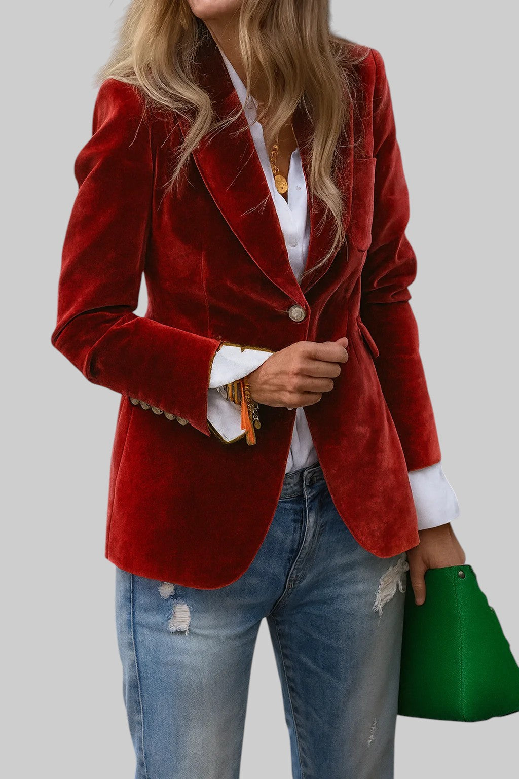 See täpselt lõigatud sako, millel on rikkalik sametine pind ja ühe nööbiga kinnitamine, loob puhta, elegantselt struktureeritud silueti. Pehmed kuldsed nööbid mansettidel lisavad tagasihoidliku detaili, samas kui teravad kraed ja pehmelt vooderdatud õlad annavad klassikalise šarmi. Kitsa lõikega sako sobib vaevata nii vabade teksade kui ka elegantsemate rõivastega, luues rafineeritud, kuid universaalse välimuse.